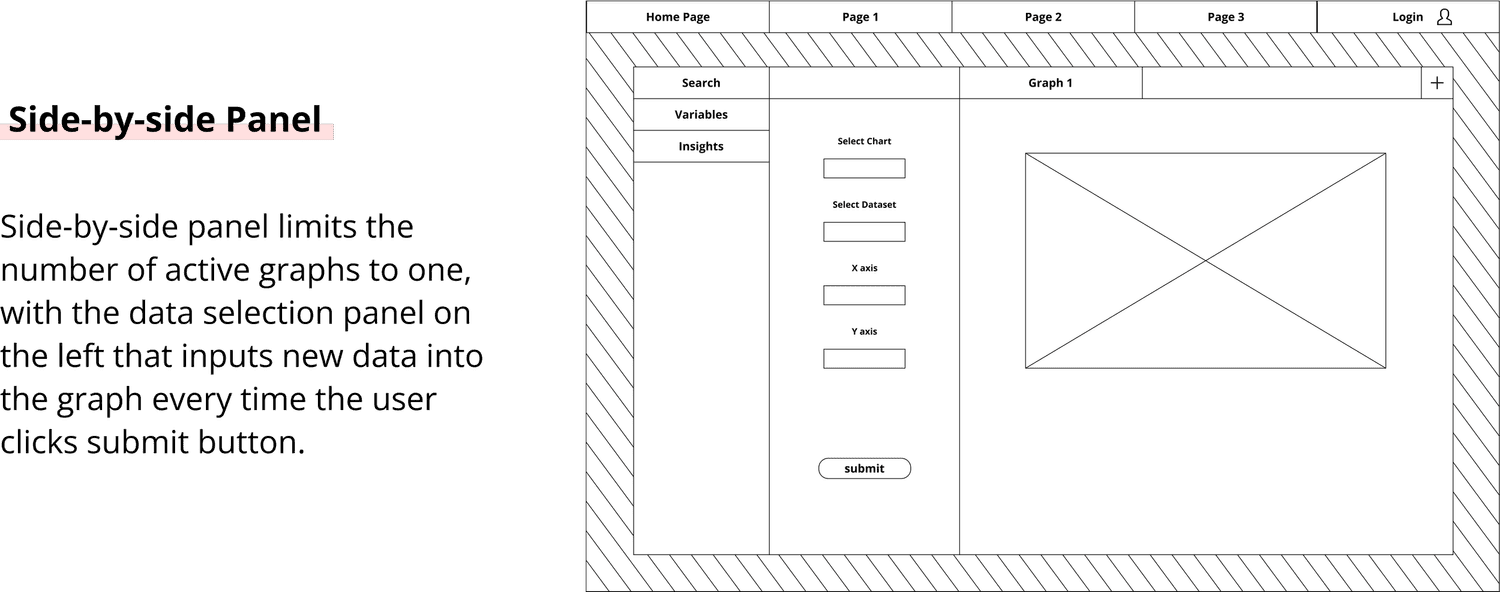 The first design focused on functionality. One major task for students is to compare and summarize different graph types. We created a multi-panel visualization wireframe, emphasizing prominent functionality and data visualization logic.