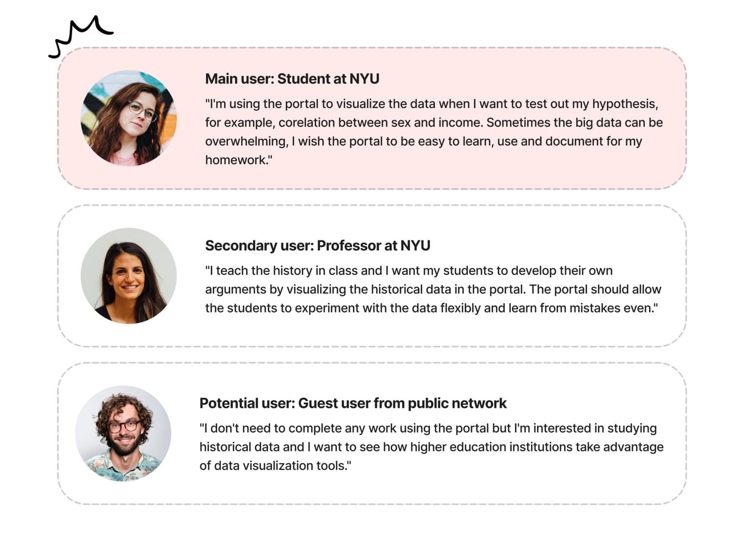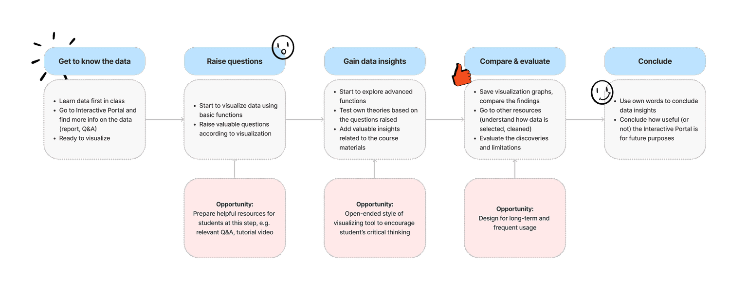 The main user will be students who take a history class and use the data portal to complete assignments. The secondary user will be professors who add the portal as a tool in the syllabus. After interviewing future student users, we identified the user journey as 5 steps: from getting to know the data in class to using the visualization tool and developing data insights independently.
