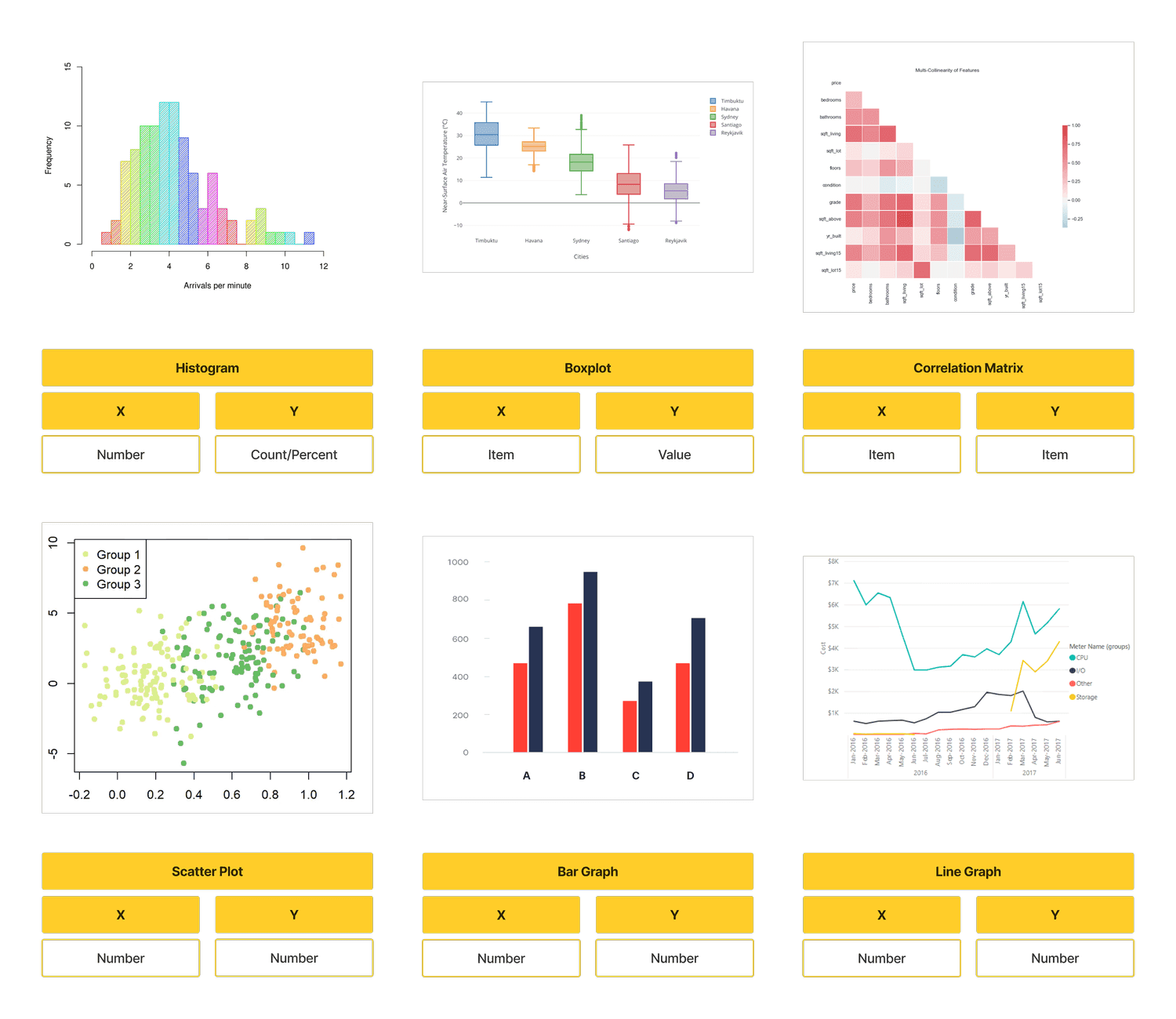 We studied graph types — histogram, box plot, correlation matrix, scatter plot, bar graph and line graph — and chose Plotly as our visualization library. It is a powerful library that enables many customizable functions, and we selected a list of universal features to employ across all graphs to increase functionality.